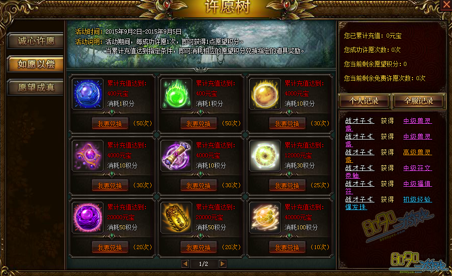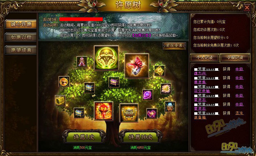 活动说明:活动期间,每累计充值2000元宝,即可获得1次免费许愿次数!同时您也可以花费元宝直接进行许愿,许愿优先消费免费许愿次数!成功许愿1次,即可获得1点许愿积分,积分可在【如愿以偿】处兑换极品奖励!
