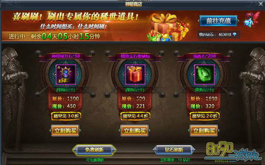 活动期间将开放神秘商店,各类进阶石,各类洗炼,神印进阶石等,都有可能出现超低价,各种超低折扣不容错过!同时,可以根据个人需要,刷新神秘商店内出售的物品,每次刷新,都有可能会出现不同的物品!