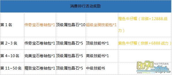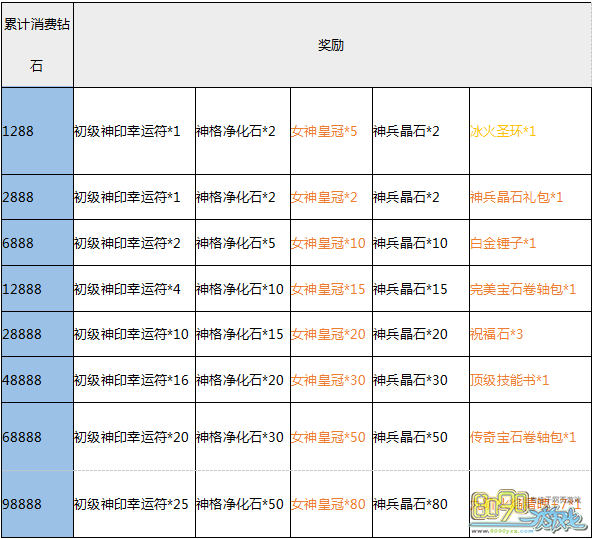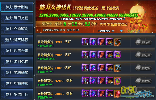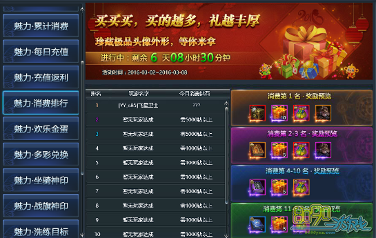【活动内容】:活动期间累计消费达到一定额度即可全面返还豪礼!大量神格净化石、超稀有牧师冰火圣环、高级神印幸运符、999朵蓝玫瑰、高级、顶级技能书,极品道具不可错过!