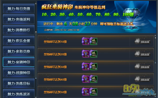 【活动内容】:喜迎坐骑神印系统开放,提升坐骑神印至指定等级,即可领取丰厚奖励!