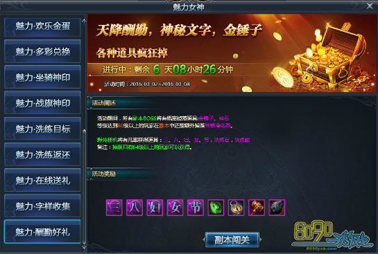 【活动内容】:打BOSS,掉金锤子和神石!80级以上玩加载副本中还能额外掉落神格净化石;