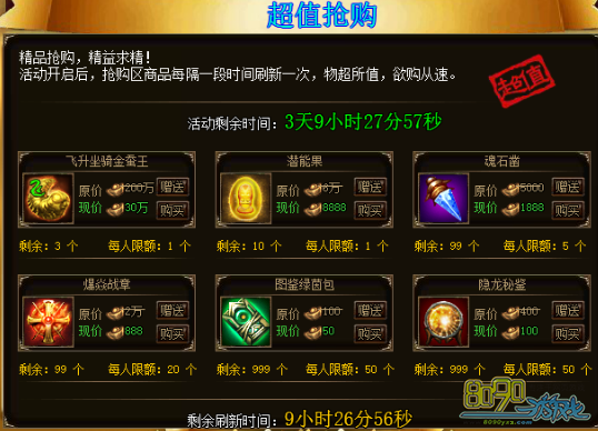 活动详情:活动开启后,抢购区商品每隔一段时间刷新一次,玩家可通过超低的价格抢购各种稀有道具,限量发售,物超所值,欲购从速!