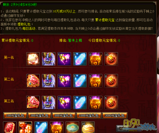 b) 活动期间,玩家每天累计提取元宝达到188、388、888、1888、3000即可在面板领取相应的每日充值礼包,礼包每日重置,当天没有领取的奖励第二天零点时以邮件补发。