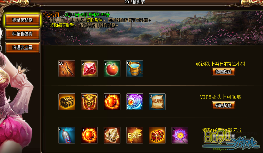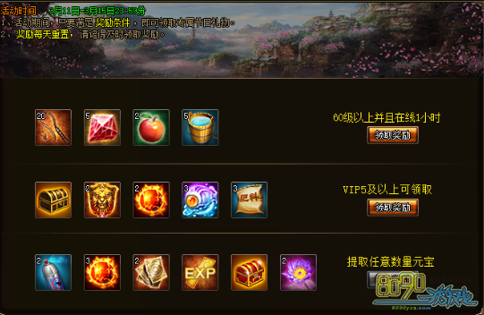 活动开启后,玩家每天完成相应的奖励目标即可领取相应奖励,条件分别为:60级以上每天登陆一小时、VIP等级达到5级以上、每日充值至少1元宝。奖励每日重置,当天满足条件不领取不会补发,玩家需及时领取。