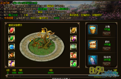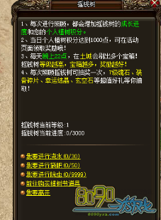 活动期间,玩家可以通过NPC上点击对应的选项消耗水桶/肥料/除虫剂对金钱树进行照顾,每次照顾都会增加摇钱树的成长进度和个人植树积分同时获得道具奖励,奖励直接发放到背包,有几率获得稀有道具。活动期间,每天晚上22:00摇钱树都会在土城降下金钱雨[没有奖励],金钱雨过后[22:01]会在摇钱树附近刷出各种宝箱,摇钱树等级越高宝箱数量越多而且奖励越好。