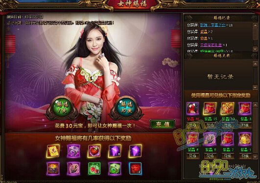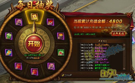 【活动内容】活动期间,玩家每充值300元宝即可获得每日转盘次数一次,转动转盘即可获得各种珍贵道具,赢取极品传奇装备!