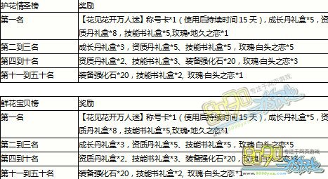 【活动内容】在活动期间,玩家通过赠送鲜花与收取鲜花获得魅力值,登上护花情圣榜(男生排行榜)与宝贝鲜花榜(女生排行榜),排名在前50名的玩家可以获得丰厚奖励!活动奖励将会在次日凌晨通过邮件发放。
