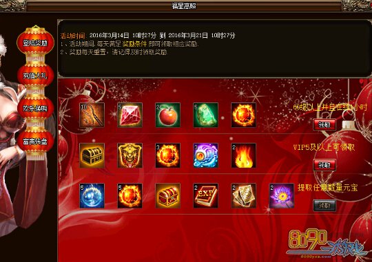 活动开启后,玩家每天完成相应的奖励目标即可领取相应奖励,条件分别为:60级以上每天登陆一小时、VIP等级达到5级以上、每日充值至少1元宝。奖励每日重置,当天满足条件不领取不会补发,玩家需及时领取。