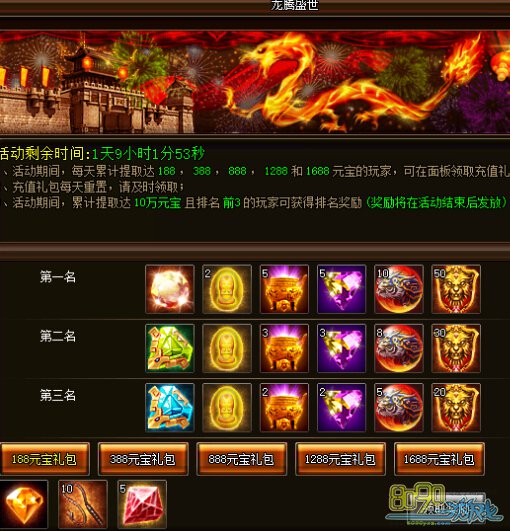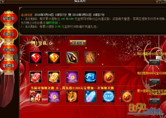 b) 活动期间,玩家每天累计提取元宝达到188、388、888、1288、1688即可在面板领取相应的每日充值礼包,礼包每日重置,当天没有领取的奖励第二天零点时以邮件补发。