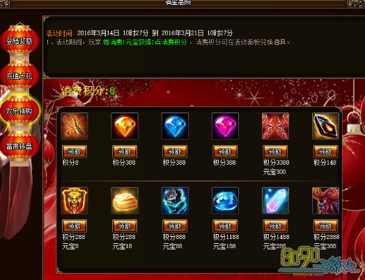 活动期间,玩家每消费1元宝即获得1点消费积分,同时消费积分可在活动面板兑换丰富奖励。
