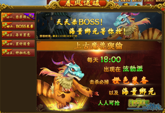 活动内容:活动期间18点在“泫勃派”1线固定刷新1只BOSS,击杀BOSS后可获得当前世界等级的橙色装备以及海量绑元。