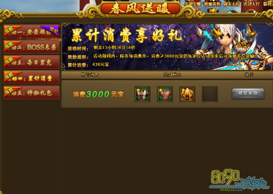 活动内容:活动期间内,除市场消费外,累计消费≥3000元宝的玩家将获得丰厚奖励。