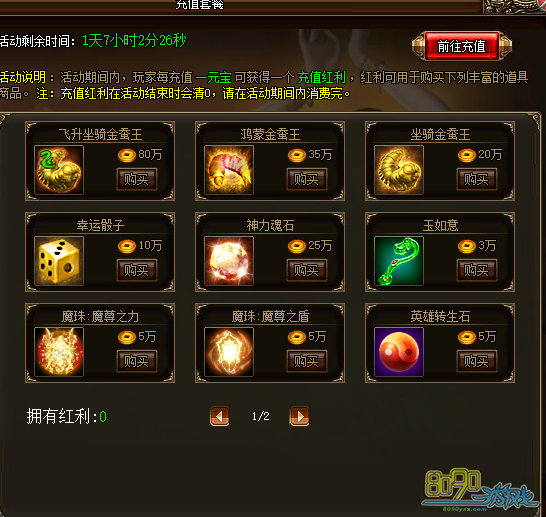 活动详情:活动期间,玩家每充值一元宝可获得一个充值红利,红利可用于购买丰富道具商品。要注意的是,充值红利会在活动结束时清0,请在活动期间内消费完。