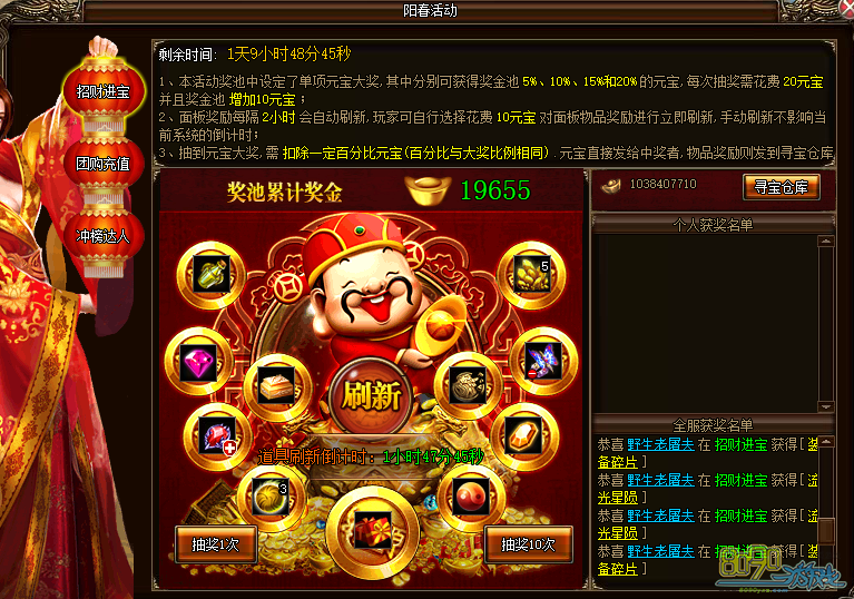 a) 活动期间,玩家可在活动面板抽奖,每次抽奖需要花费20元宝并且奖池累计奖金增加10元宝