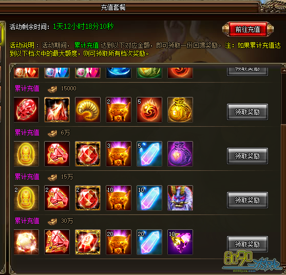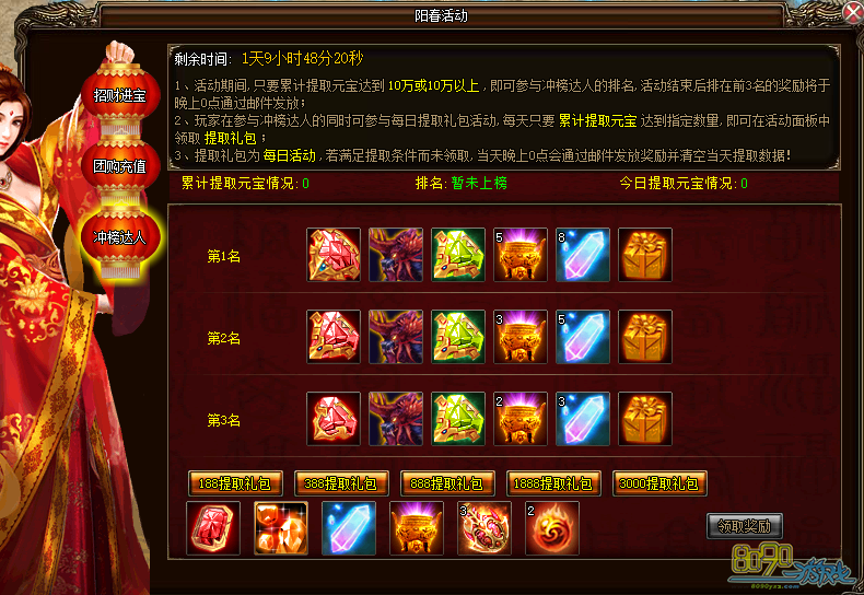 b) 活动期间,玩家每天累计提取元宝达到188、388、888、1888、3000即可在面板领取相应的每日充值礼包,礼包每日重置,当天没有领取的奖励第二天零点时以邮件补发。