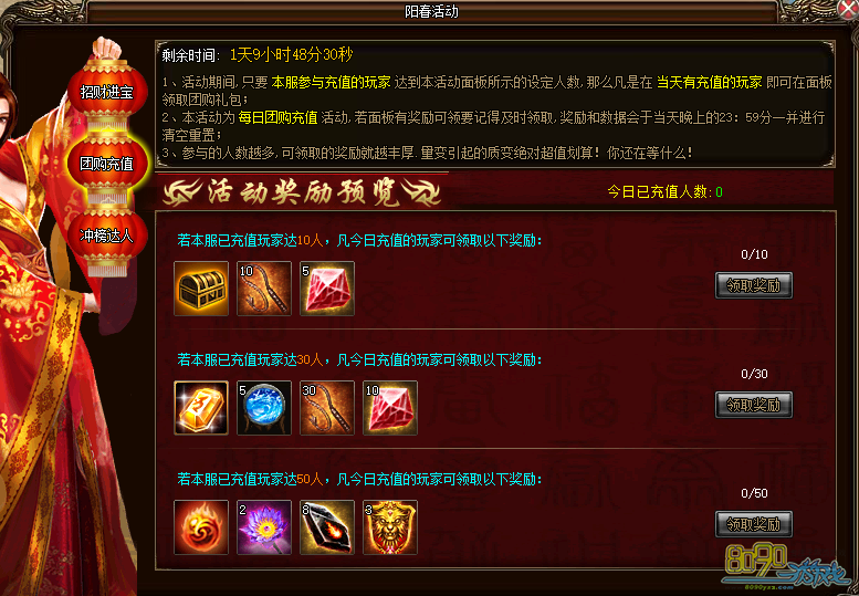 活动期间,只要每天本服参与充值的玩家数量达到活动面板设定的人数,当天有充值的玩家即可在面板领取对应的团购礼包,礼包每天只可领取一次,团购礼包每天23:59进行清空重置,不进行补发,需玩家及时领取。