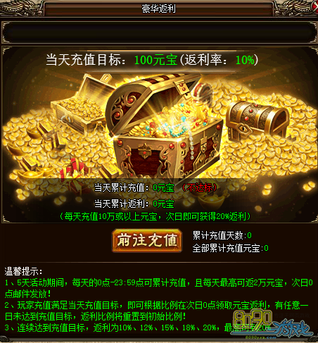 活动详情:活动期间,每天0:00-23:59可累计充值,且每天最高可返2万元宝,次日0点邮件发放。玩家充值满足当天充值目标,即可根据比例在次日0点领取元宝返利,有任意一日未达到充值目标,返利比例将重置到初始比例。连续达到充值目标,返利为10%、12%、15%、18%、20%,最高可到20%。