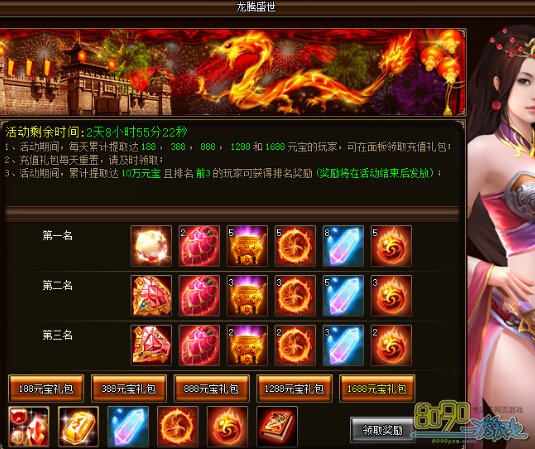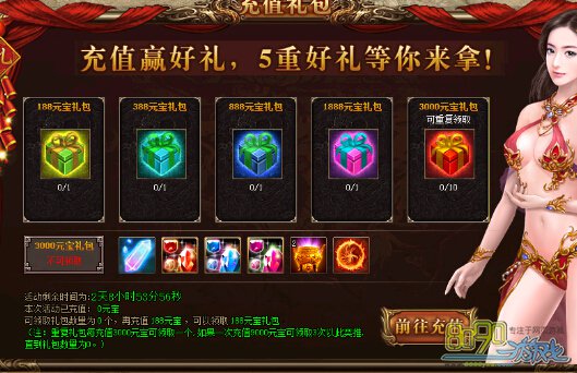 b) 活动期间,玩家每天累计提取元宝达到188、388、888、1288、1600即可在面板领取相应的每日充值礼包,礼包每日重置,当天没有领取的奖励第二天零点时以邮件补发。