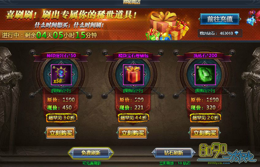 活动期间将开放神秘商店,各类进阶石,各类洗炼,神印进阶石等,都有可能出现超低价,各种超低折扣不容错过!同时,可以根据个人需要,刷新神秘商店内出售的物品,每次刷新,都有可能会出现不同的物品!