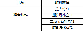 【活动内容】活动期间,玩家参与跨服副本和罗摩密境副本可以获得“踏青礼包”,打开可以获得丰富道具奖励。