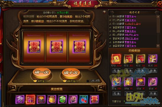 【活动内容】活动期间,玩家可以参与福星连连,挑战好运气,赢取丰厚道具,积分换取传奇装备!