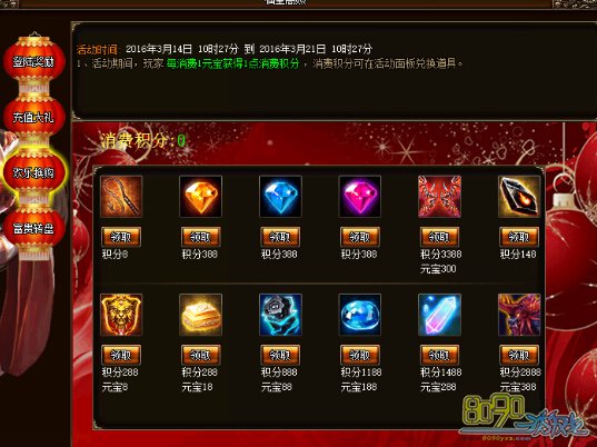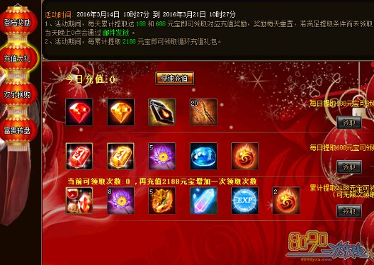 b) 活动期间,玩家每天累计提取元宝达到188、388、888、1888、3000即可在面板领取相应的每日充值礼包,礼包每日重置,当天没有领取的奖励第二天零点时以邮件补发。