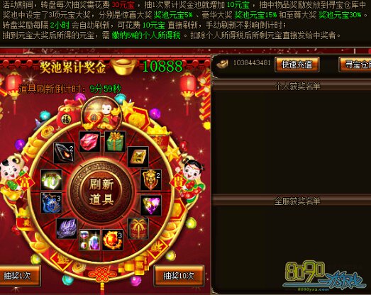 活动期间,玩家可以通过面板抽奖按钮进行抽奖,每次抽奖需花费30元宝,每抽1次累计奖金池就增加10元宝,抽中物品奖励直接发放到寻宝仓库中,奖池中设定了3项元宝大奖,分别是惊喜大奖、豪华大奖和至尊大奖,抽中后获得奖池累积的百分比元宝奖励,抽到元宝大奖所得的元宝,需扣除5%的个人所得税,扣除后所剩元宝直接发放给中奖者,比如抽中了5%的元宝大奖,那实际获得的是奖池累积奖金*5%*(1-5%)的元宝。面板奖励每隔1小时自动刷新,可点击面板中间的刷新道具按钮花费10元宝对面板物品奖励进行刷新