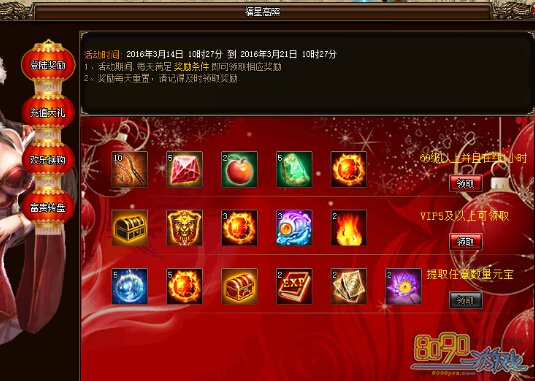 活动开启后,玩家每天完成相应的奖励目标即可领取相应奖励,条件分别为:60级以上每天登陆一小时、VIP等级达到5级以上、每日充值至少1元宝。奖励每日重置,当天满足条件不领取不会补发,玩家需及时领取。