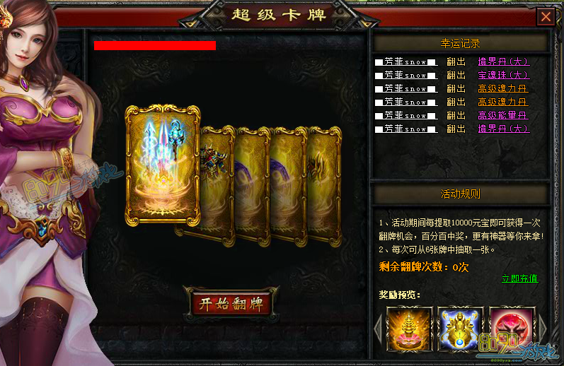 【活动内容】:活动期间,每提取10000元宝,即可获得一次翻牌机会,翻牌百分百中奖,每次翻牌从六张牌中抽取一张,获得珍稀道具。