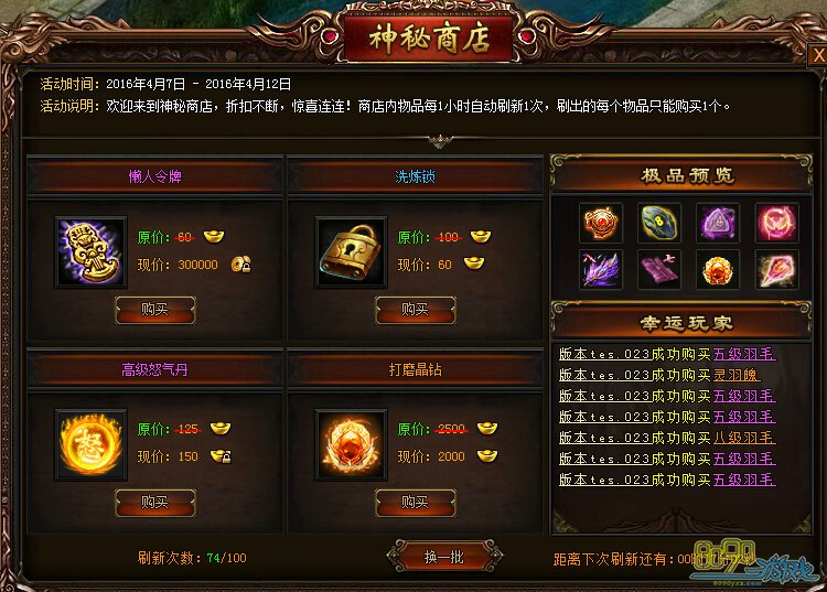 战天4月8日-9日神秘道具 神秘折扣低价无下限 来源:8090游戏日期:2016-04-07 18:32 活动一:神秘商店 活动时间:4月8日0点~9日24点 活动内容:活动期间,神秘商店出现大量折扣道具!惊喜连连。快来抢购吧!