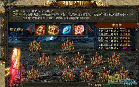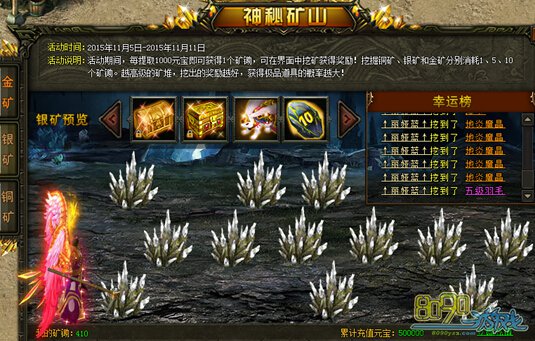 【活动内容】:活动期间,每提取1000元宝即可获得1个矿锄,在界面内挖矿可获得奖励!挖掘1次铜矿、银矿、和金矿分别消耗1、5、10个矿锄,越高级的矿堆可挖出的奖励越丰富,获得极品道具的几率也越大!