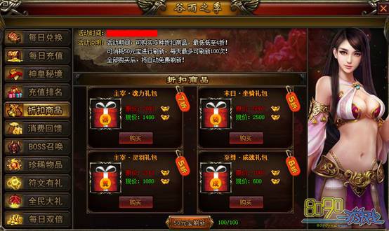 【活动说明】:活动期间,可购买多种折扣商品,全场最低低至4折!可消耗50元宝进行刷新,每天最多可刷新100次!全部购买后,将自动免费刷新!