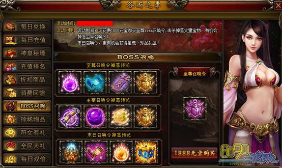 【活动说明】:活动期间,可花费1888元宝购买至尊boss召唤令,击杀掉落大量宝物,有几率掉落主宰召唤令!末日召唤令,更有机会获得星魂,珍品礼盒!