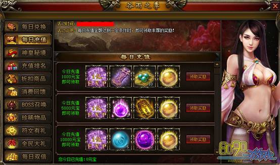 【活动说明】:每日充值金额达到一定条件时,可领取一份奖励。