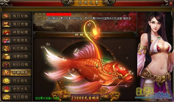 【活动说明】:活动期间,累积充值金额达到38888元宝,即可花费23888元宝购买幻化坐骑。