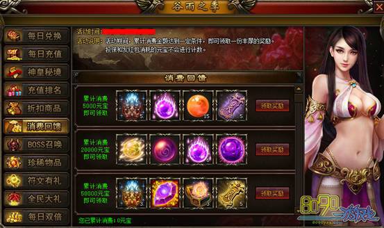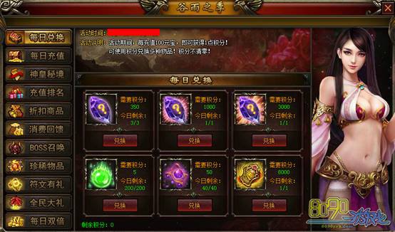 【活动说明】:活动期间,每充值100元宝,即可获得1点积分!可使用积分兑换多种物品!积分不清零!