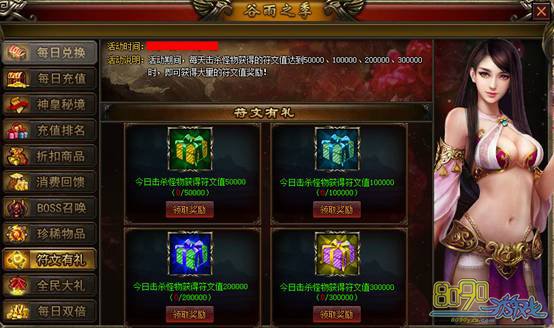 【活动说明】:活动期间,每天击杀怪物获得的符文值达到50000、100000、200000、300000时,即可获得大量的符文值奖励!