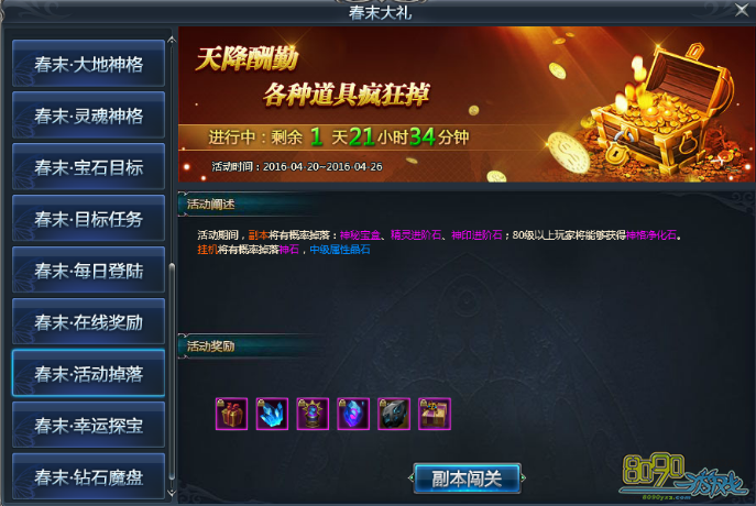 【活动内容】:活动期间,副本将有概率掉落:神秘宝盒,精灵进阶石,神印提升石;