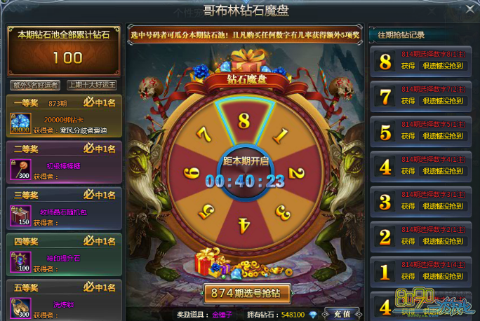 【活动内容】:活动期间,玩家每天10~17点,17~22点可以参与钻石魔盘的有奖竞猜,可通过界面进行相应号码的投注,每次投注的玩家都将获得“金锤子”一个。同时,玩家投注的金额会记录到奖池中;