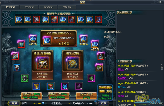 【活动内容】:活动期间玩家进行探宝,将额外获得30%的天神币收入,获得暗金装备速度更快,更容易!同时,使用钥匙进行探宝也可以获得天神币收入。