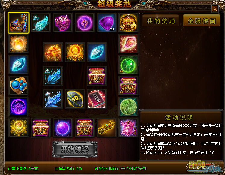 活动内容:活动期间,每累计充值满5000元宝,可获得一次外环转动机会,每次在外环转动都有一定机会暴击获得额外的奖励。活动期间转动次数为10的倍数时,本次可在内环转动活动奖励!大量道具等你来拿哦!