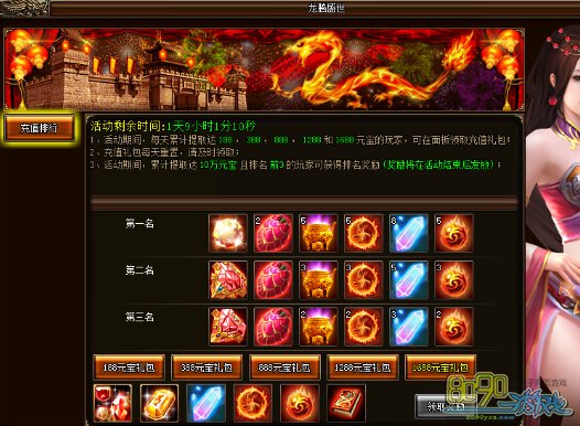 b) 活动期间,玩家每天累计提取元宝达到188、388、888、1288、1688即可在面板领取相应的每日充值礼包,礼包每日重置,当天没有领取的奖励第二天零点时以邮件补发。