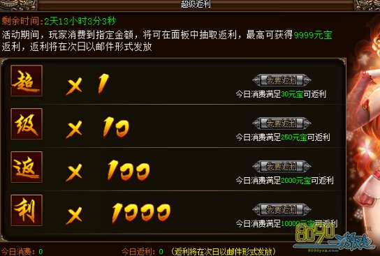 活动详情:玩家消费到制定金额,将可在面板中抽取返利,最高可获得9999元宝返利,返利将在次日以邮件形式发放。