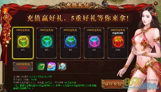 活动详情:活动期间充值达到指定元宝数,即可领取一份对应充值礼包,3000元宝礼包更可重复充值领取10次,每充值3000元宝可领取一个,直到礼包数为0为止。