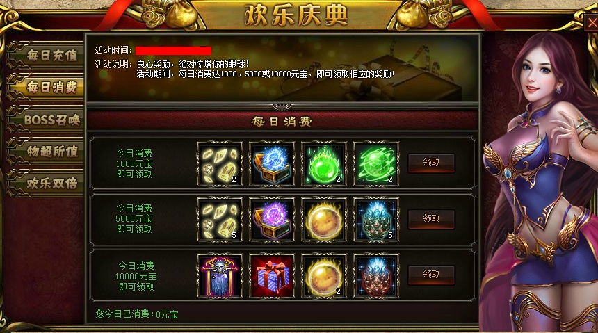 【活动内容】:活动期间,每日消费达到1000、5000、10000元宝,即可领取相应的奖励!