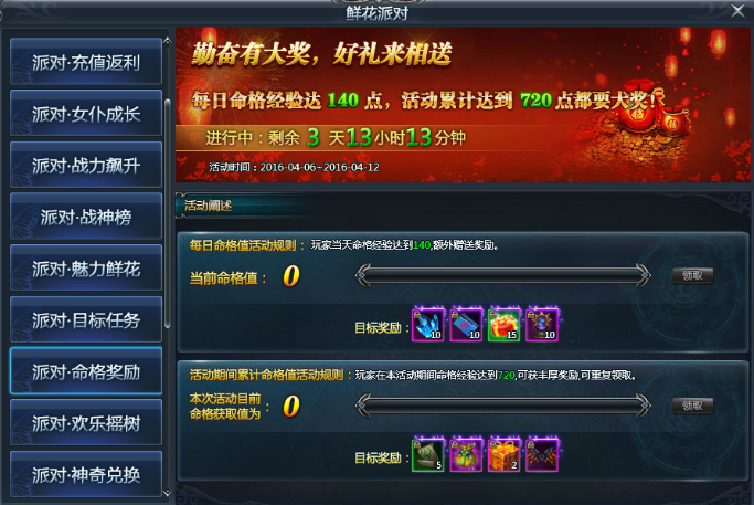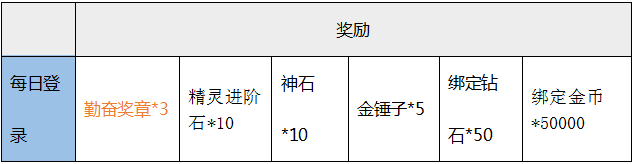 玩家当天命格经验达到140,额外赠送奖励:精灵进阶石*10,金锤子 *10,绑定初级宝石随机礼包*15,神印提升石*10,勤奋奖章*2