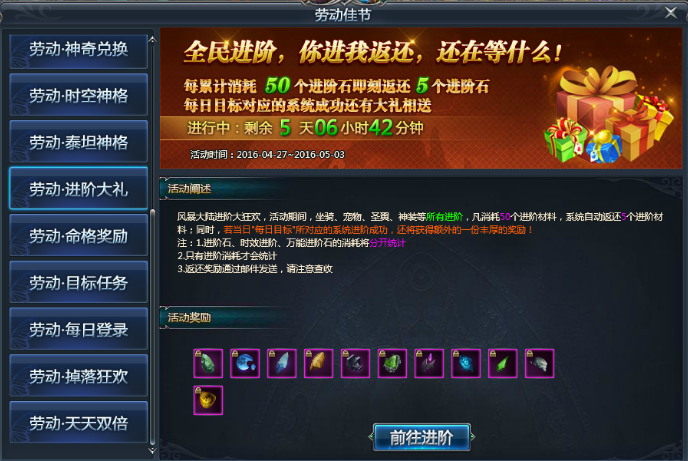 【活动内容】:风暴大陆进阶大狂欢,活动期间,坐骑、宠物、圣翼、神装等所有进阶,凡消耗50个进阶材料,系统自动返还5个进阶材料;同时,若当日"每日目标"所对应的系统进阶成功,还将获得额外的一份丰厚的奖励!