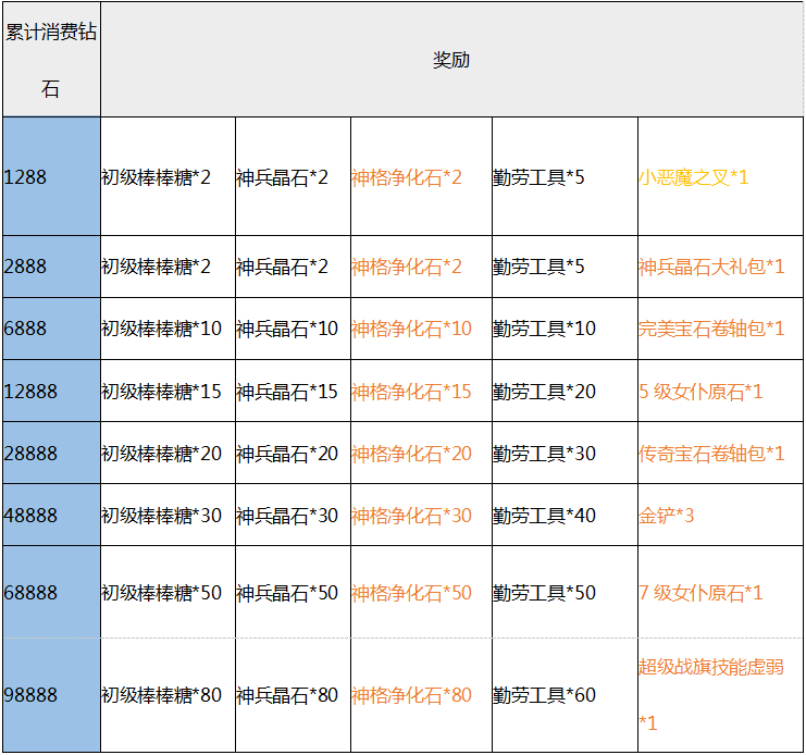 【活动内容】:活动期间累计消费达到一定额度即可全面返还豪礼!大量初级棒棒糖、神兵晶石、超稀有牧师小恶魔之叉、金铲、超级战旗技能虚弱,极品道具不可错过!