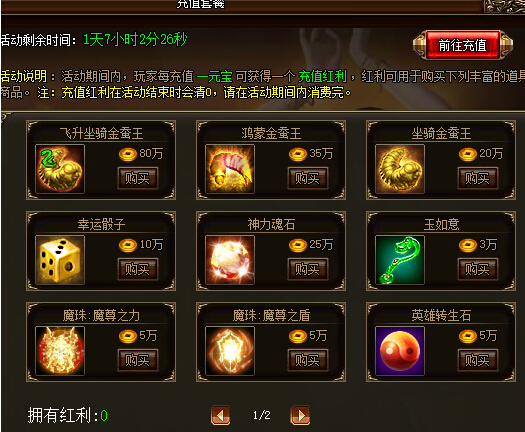 活动详情:活动期间,玩家每充值一元宝可获得一个充值红利,红利可用于购买活动中的丰富道具商品。注意:充值红利在活动结束后清零,请在活动期间内消费完哦。