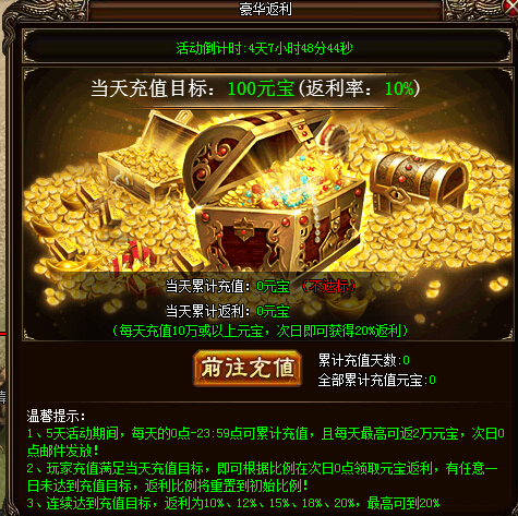 活动详情:活动期间,每天0:00-23:59可累计充值,且每天最高可返2万元宝,次日0点邮件发放。玩家充值满足当天充值目标,即可根据比例在次日0点领取元宝返利,有任意一日未达到充值目标,返利比例将重置到初始比例。连续达到充值目标,返利为10%、12%、15%、18%、20%,最高可到20%。
